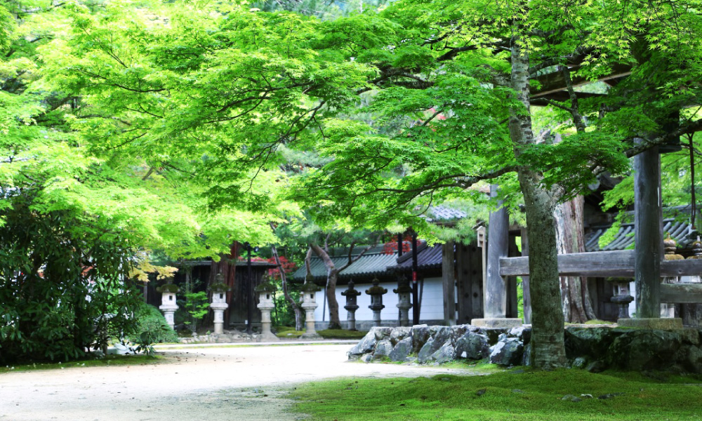 本堂東側の庭に植えられた青モミジ、初夏の新緑は眩しく、眼に優しい。堂内からの眺めは、あたかも額縁に入った絵画のようで、清寂の中、見る者の心を朗らかにしてくれる。