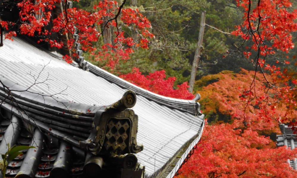 境内には数百本のイロハモミジ(高雄モミジ)が植えられており、日に照らされた紅葉の中に佇む伽藍は赤く染まった姿を表している。特に、本堂西側の廊下からの紅葉の眺めは、山内でも素晴らしい眺めである。色とりどりの紅葉を目線の高さで楽しめる。